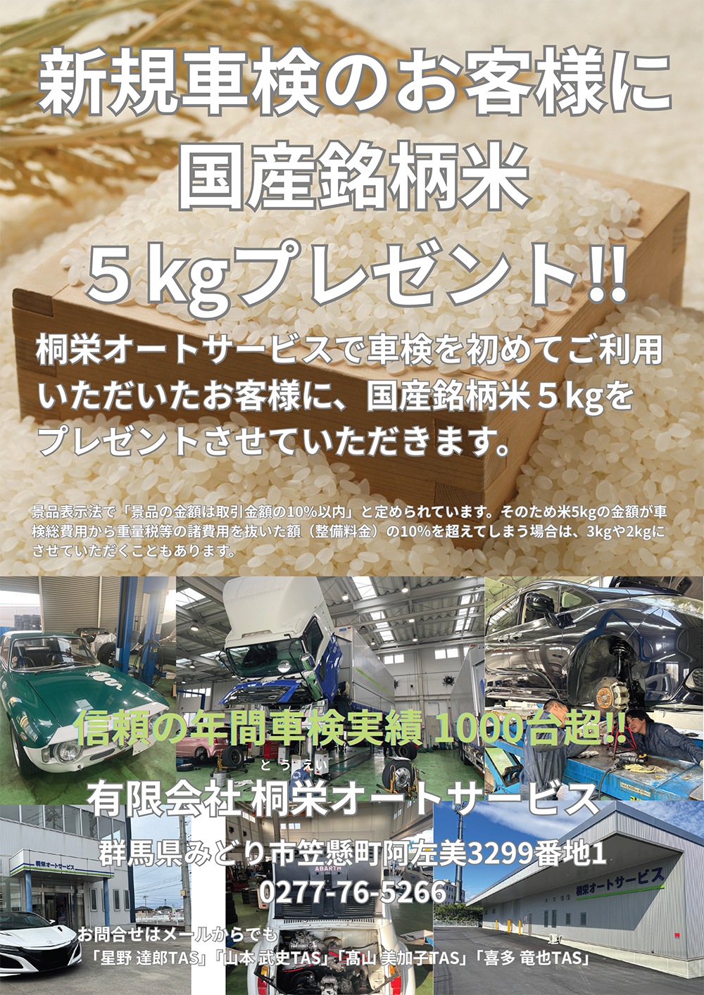 桐栄オートサービスで車検を初めてご利用いただいたお客様に、感謝の気持ちを込めて国産銘柄米5kgをプレゼントいたします。 経験豊富なスタッフが、丁寧にご対応いたします。まずはお気軽にご相談ください。
